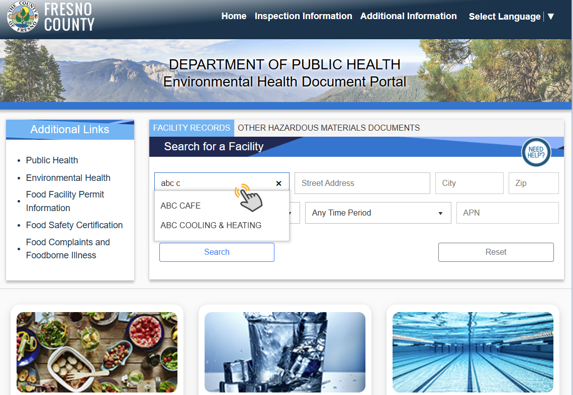 You can search through the available document from any of the fields or in any combination. You can put in a partial name in the Facility Name or Street Address field and the portal will start to display a select list where you can easily choose a facility (see Figure 2). To search for a facility, enter data into one or more of the fields:
